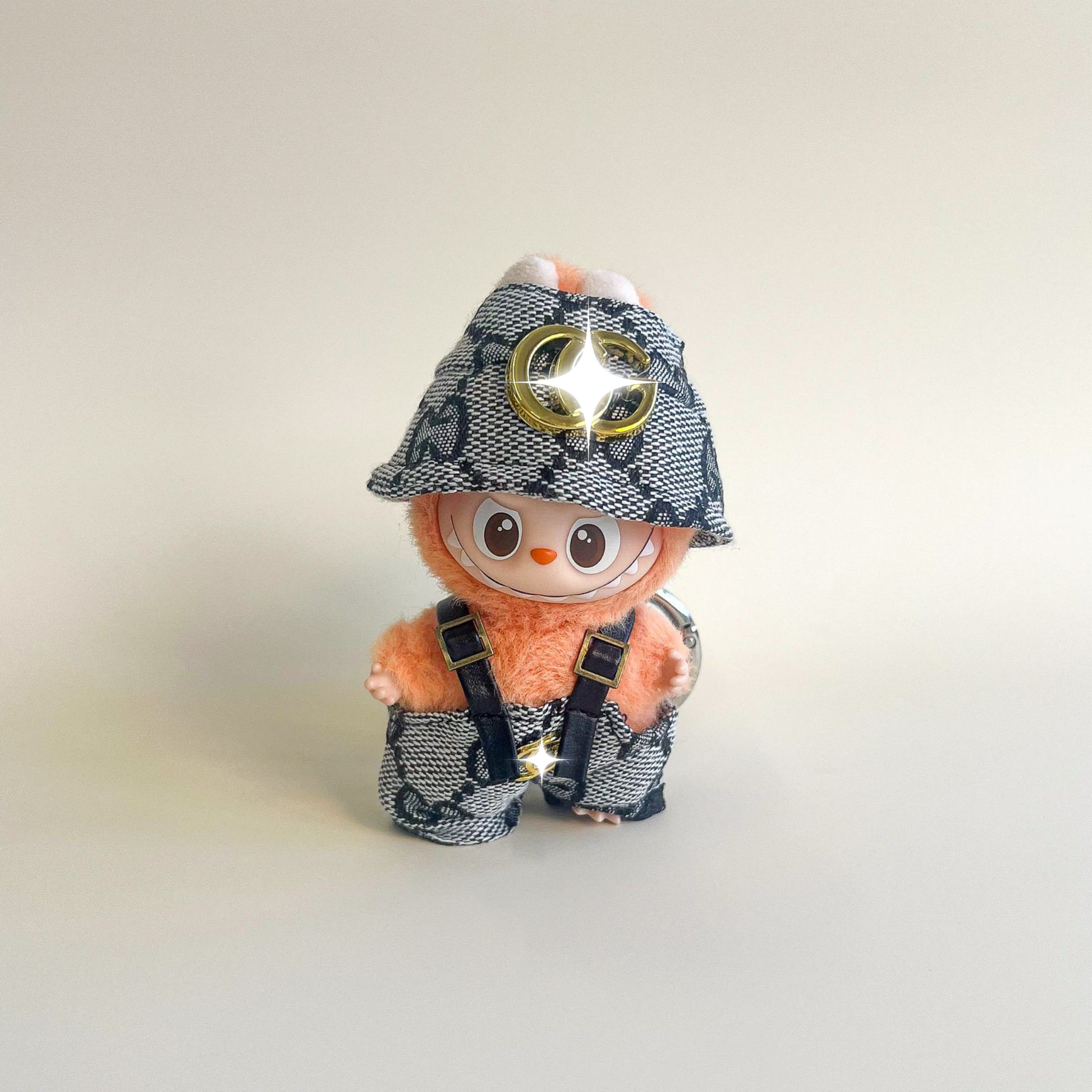 Transform your Labubu 4.0 with the Monogram Denim Suspender Outfit. This set includes monogram‑patterned denim suspender trousers and a coordinated denim bucket hat, combining playful character with refined streetwear detail. A stylish and collectible look that enhances Labubu fashion and outfits.