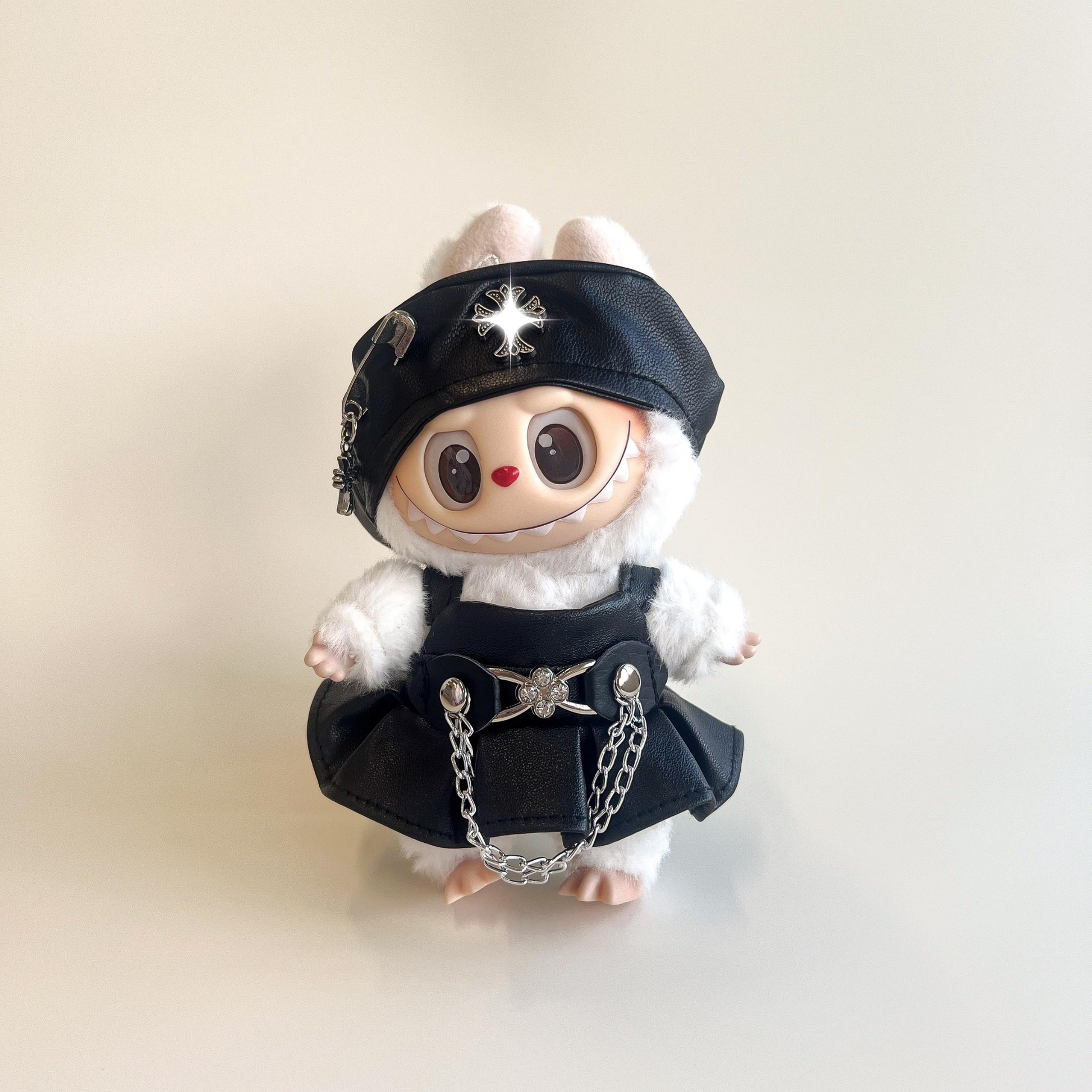Transform your Labubu with the Black Leather Fashion Dress Outfit Set. This two‑piece ensemble includes a sleek faux‑leather dress decorated with silver chain and cross accents, paired with a matching beret hat detailed with pins and charms. A chic collectible design combining edgy style with refined Labubu fashion.