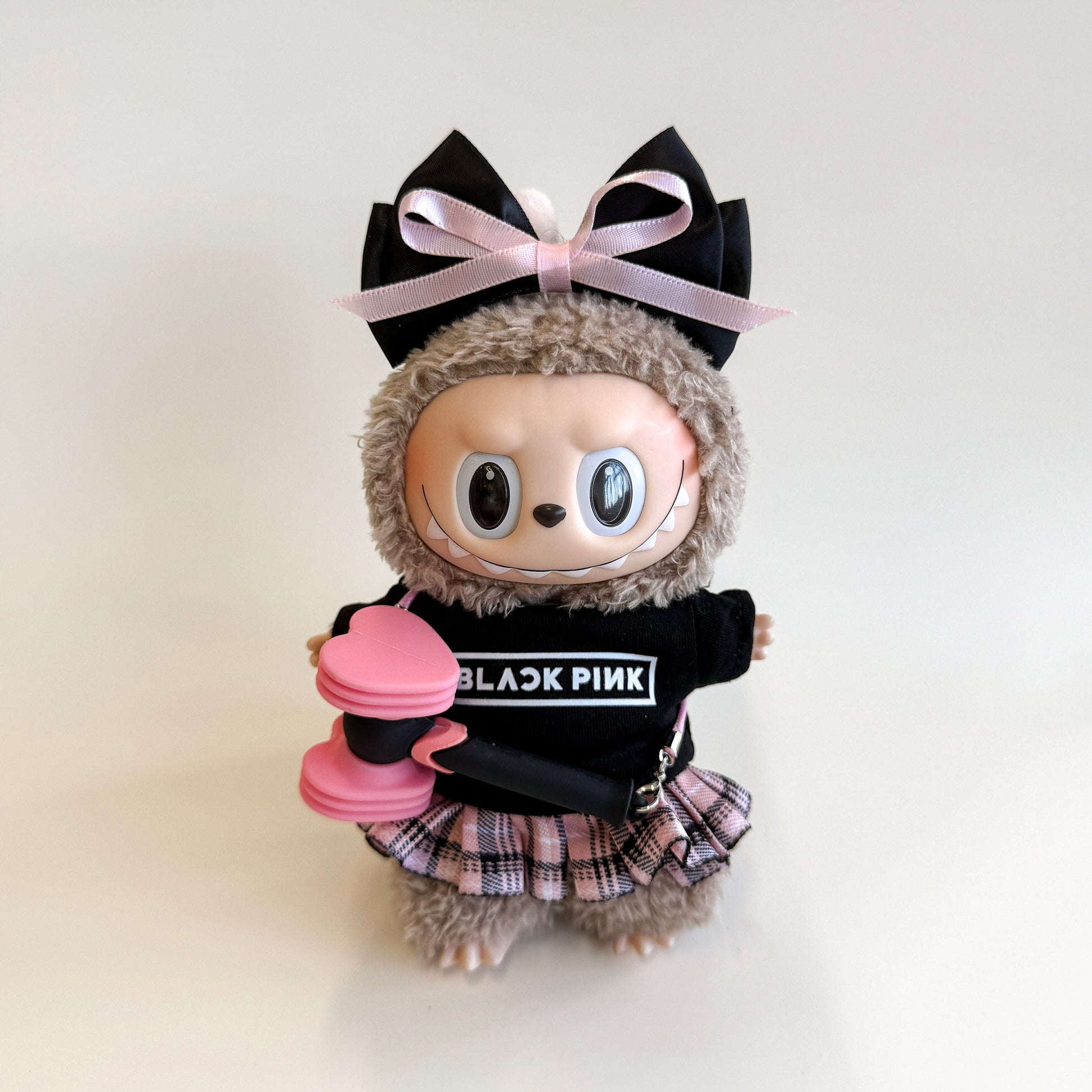Get your Labubu ready for the spotlight with the BP Inspired Outfit Set (Black Top). This coordinated 4‑piece outfit features a black printed top, plaid skirt, oversized ribbon headpiece, and a light‑style fan accessory — a fashionable, confident look worthy of a global stage.