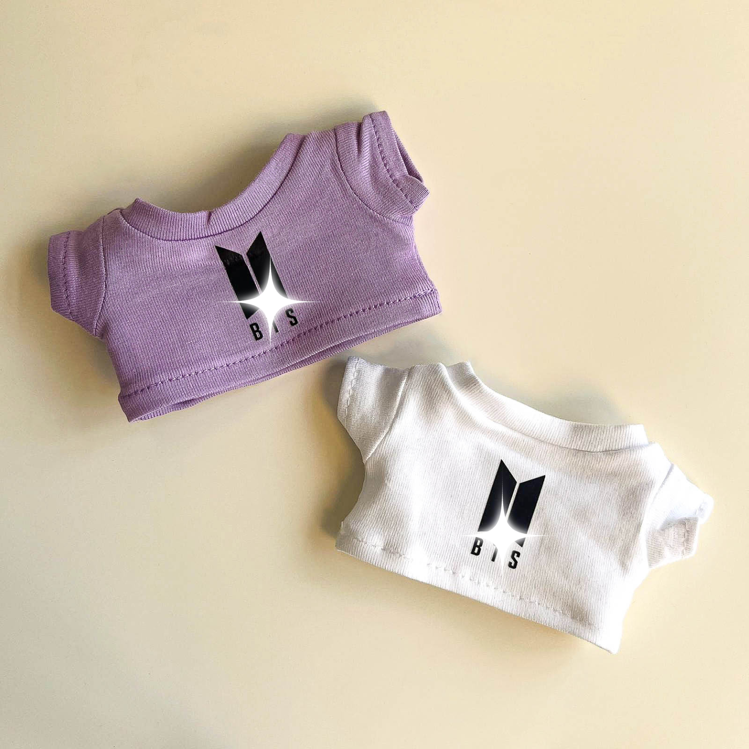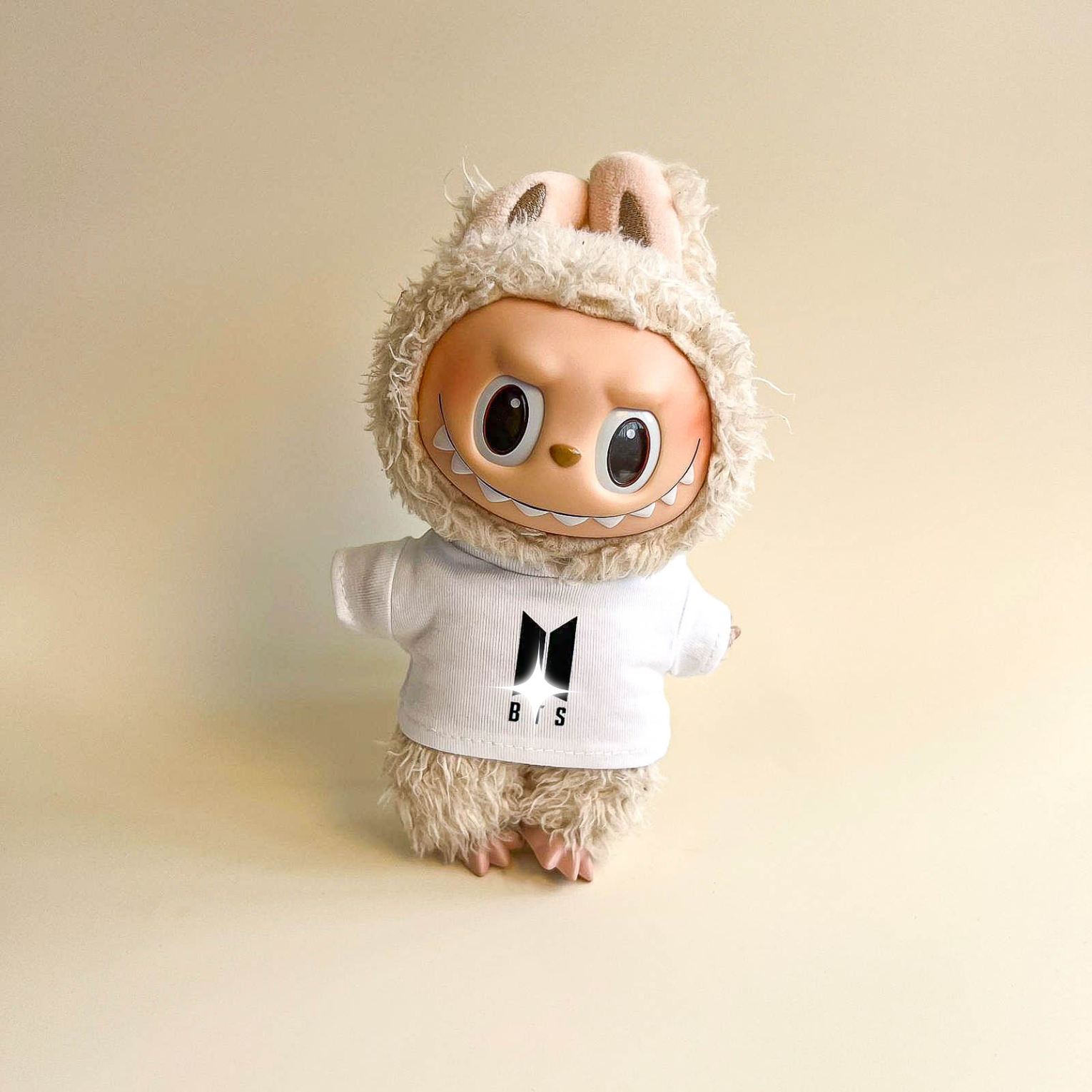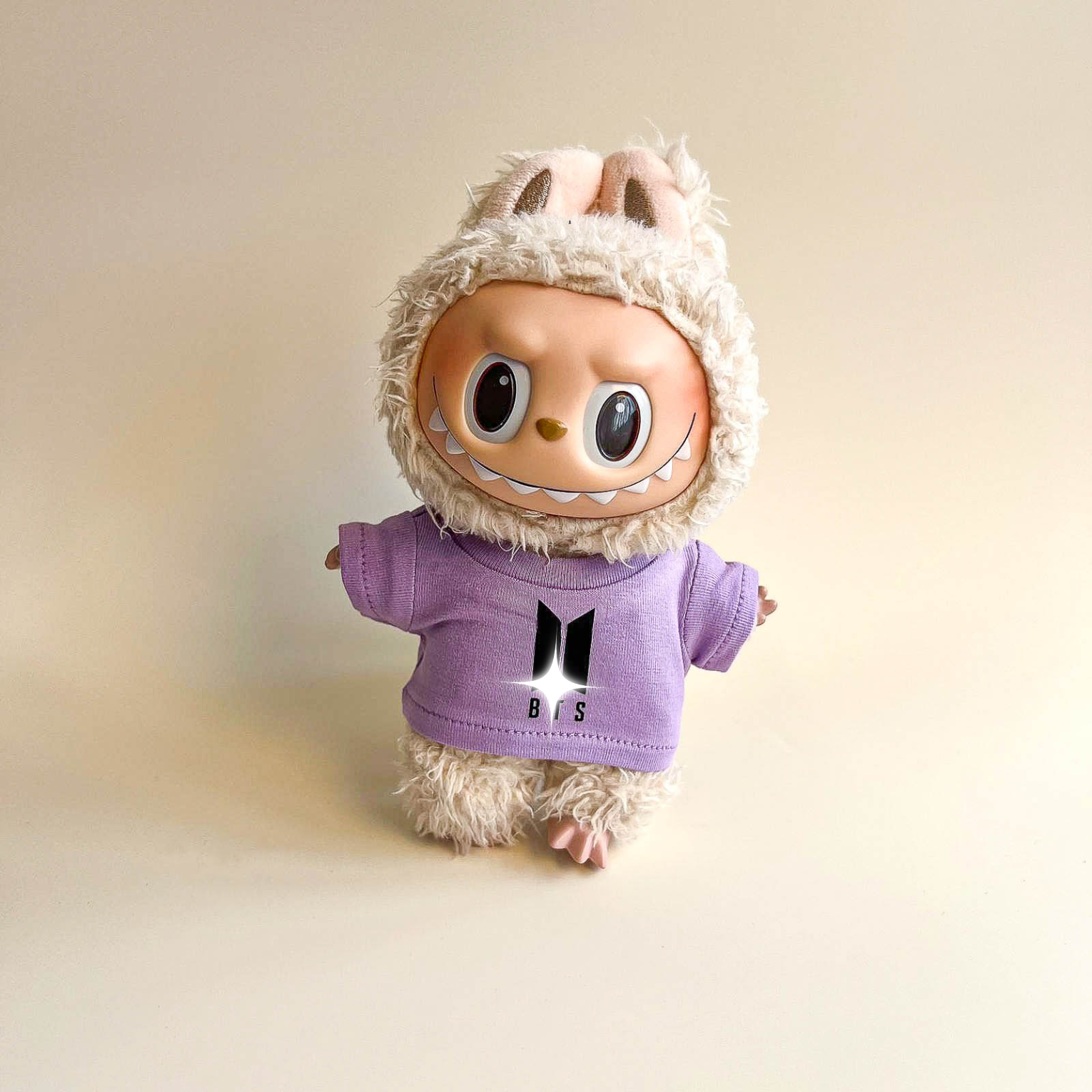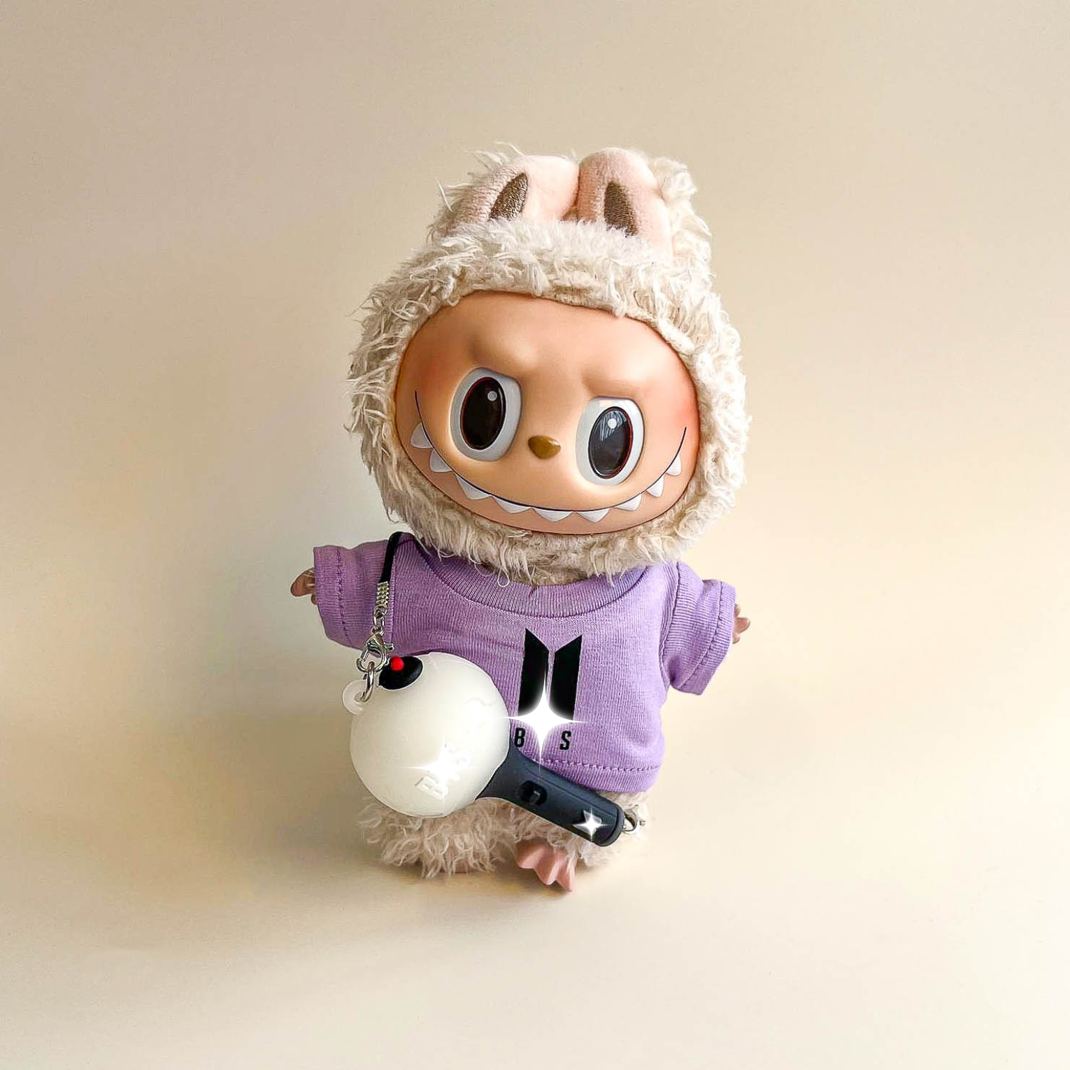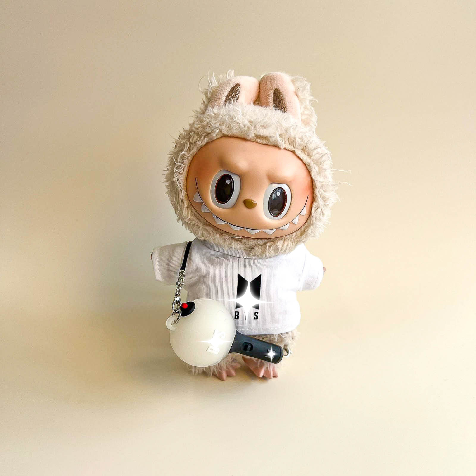 Add understated edge to your Labubu with the Bullet Proof Idol Tee Outfit in black logo. The monochrome graphic T‑shirt and mini fan lightstick create a modern, concert‑ready silhouette for display and posing. Perfect for Labubu clothes, Labubu outfits, and elevated Labubu fashion across your Labubu collection.
