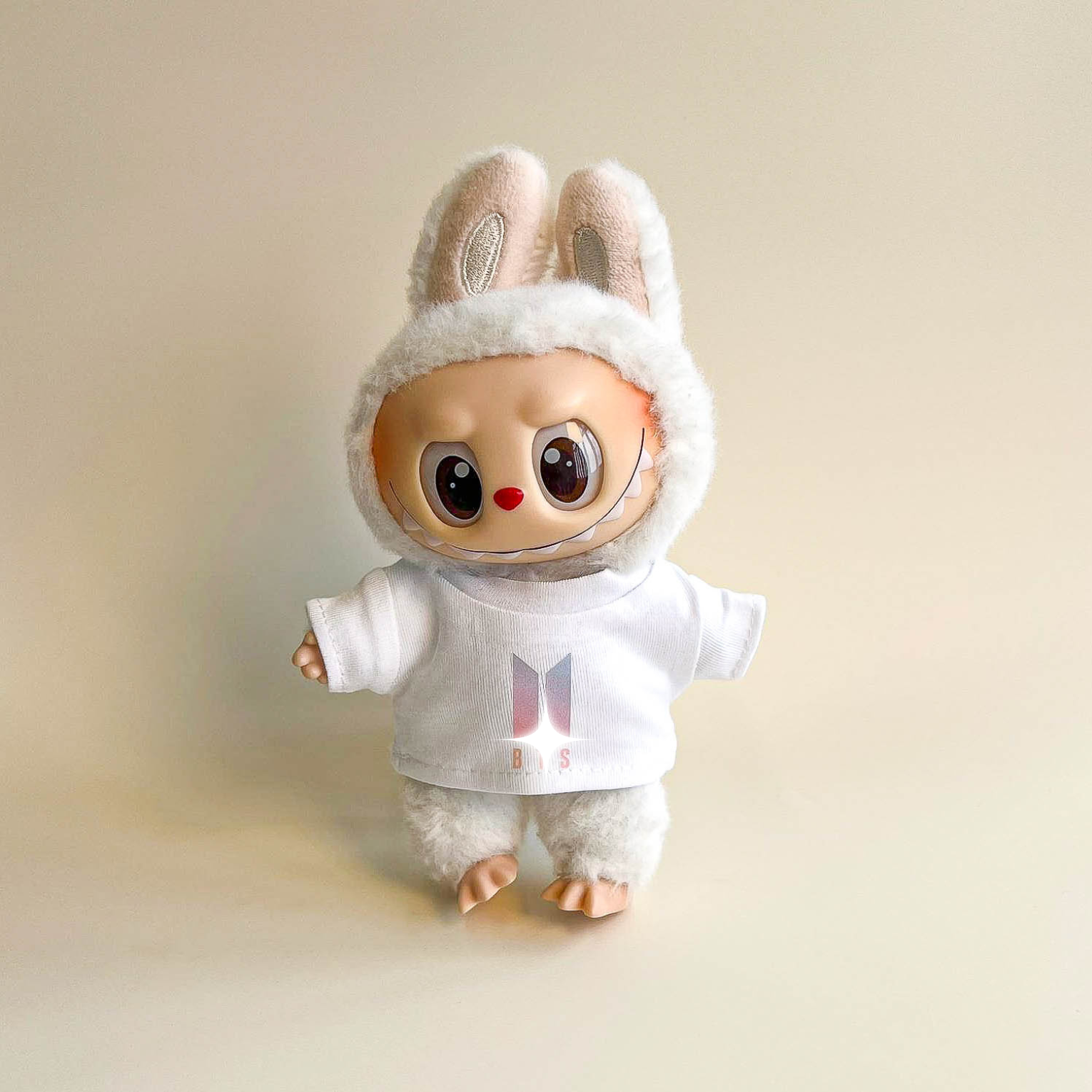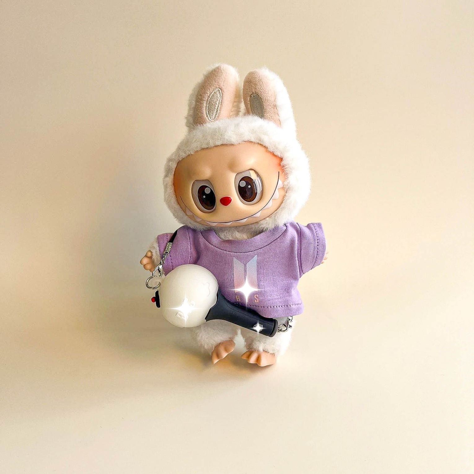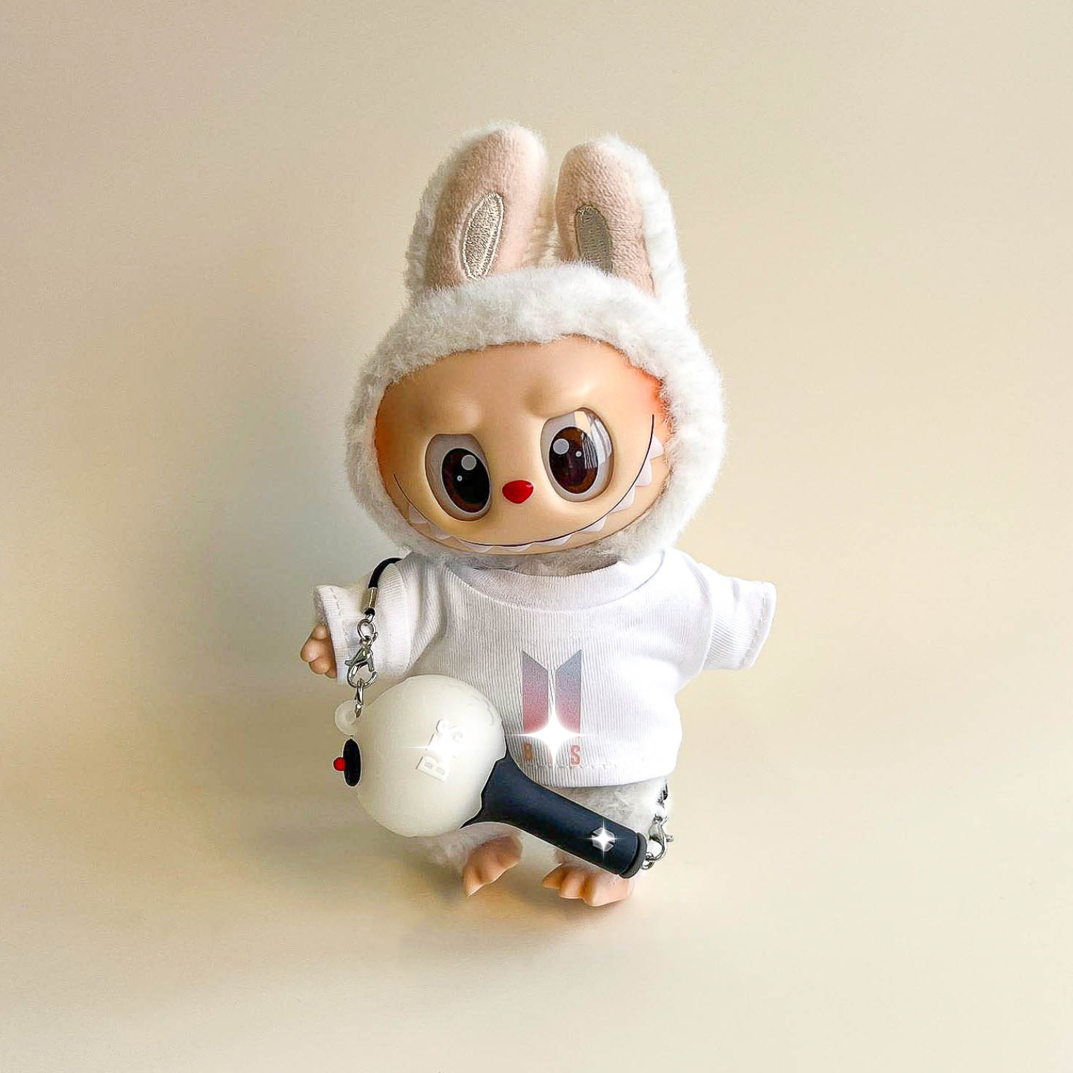 Bring vibrant energy to your Labubu with the Bullet Proof Idol Tee Outfit in colored logo. A bold color‑logo T‑shirt pairs with a mini fan lightstick on a strap for a lively, fan‑ready look. A collector‑focused upgrade to your Labubu clothes, Labubu outfits, and refined Labubu fashion.