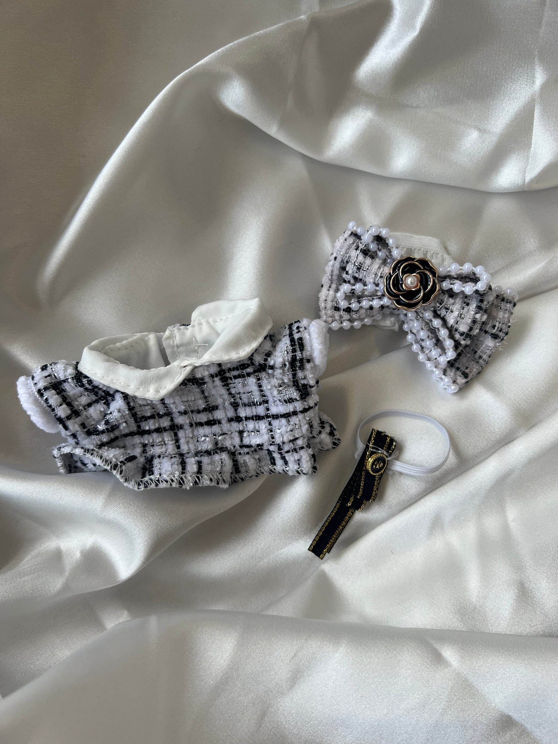 Dress your Labubu doll in ultimate sophistication with this designer-inspired tweed outfit! Featuring a chic black and white tweed jacket, an oversized bow headband adorned with pearls, and a gold-accented brooch, this outfit radiates elegance and luxury.