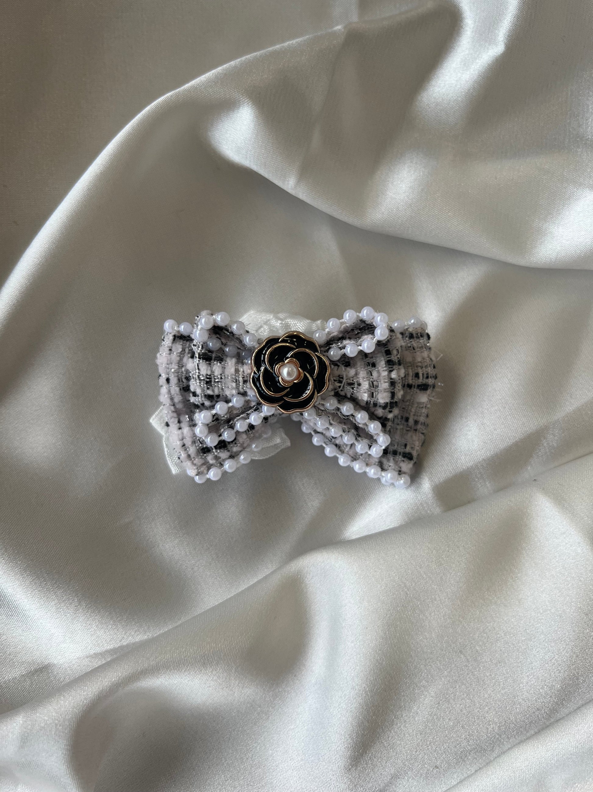 - Oversized Bow Headband: A stylish headband featuring a large bow with pearl embellishments and a designer-inspired centerpiece.