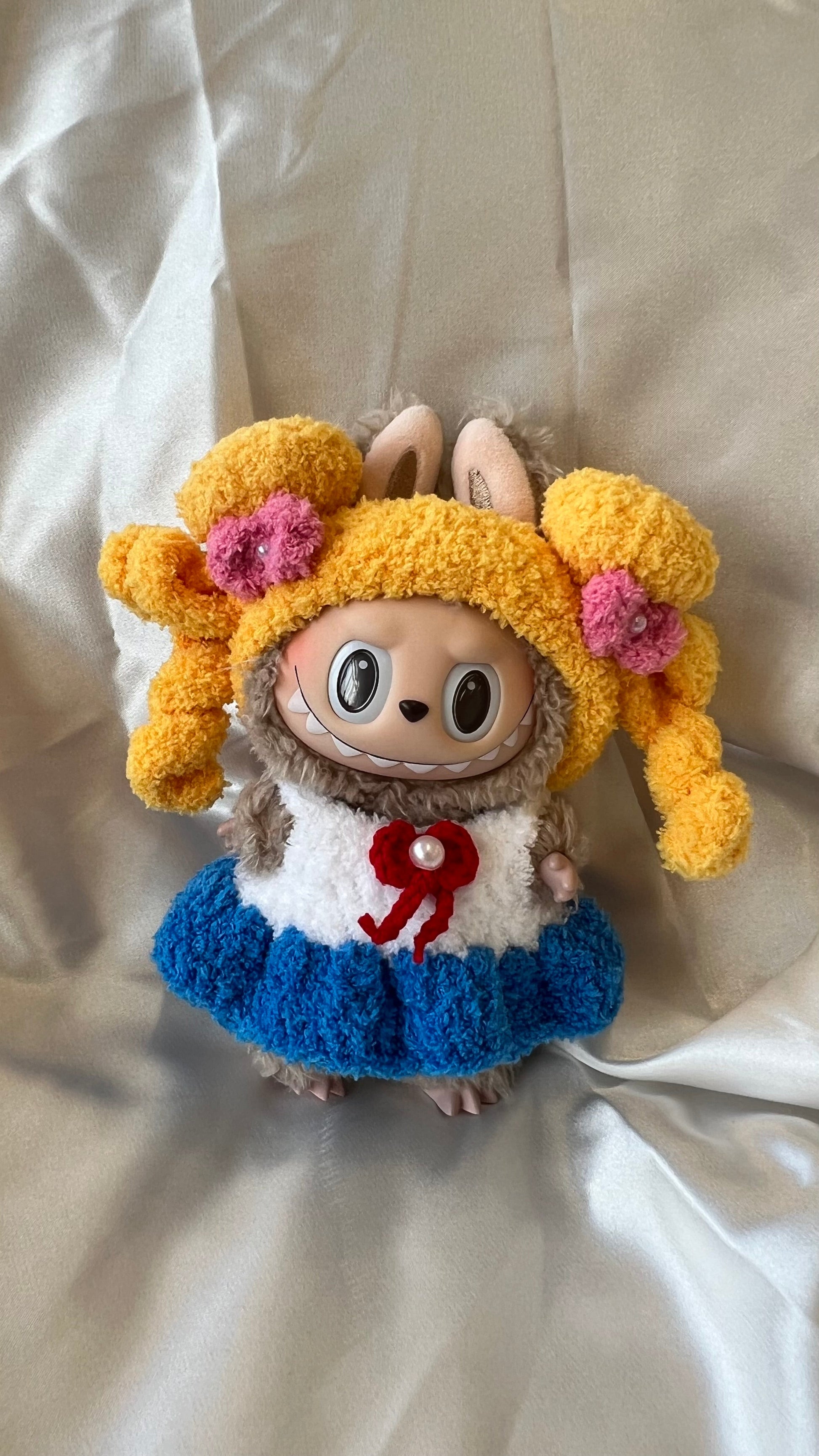 Give your Labubu doll a magical transformation with this enchanting sailor girl costume! Featuring a sailor-style dress, bright yellow pigtails with pink bows, and charming details, this outfit is perfect for collectors who adore whimsical and nostalgic designs.