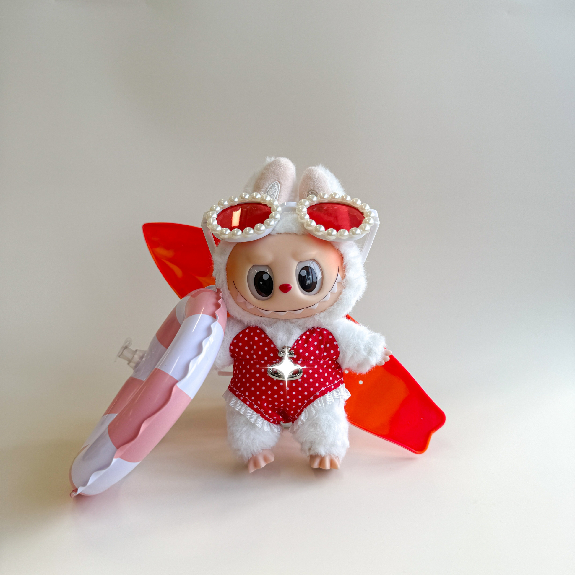 Get your Labubu summer-ready with the Red Summer Outfit Set – Swimsuit & Surfboard. This 4-piece bundle includes a playful red polka-dot swimsuit with ruffled accents, pearl-embellished sunglasses with bold lenses, a vibrant ombre surfboard, and a matching striped swim ring. Designed for sunny days and beachside fun, this set adds a splash of color and style to Labubu Clothes while enhancing any Labubu Fashion collection. Perfect for display styling, photography, or gifting.
