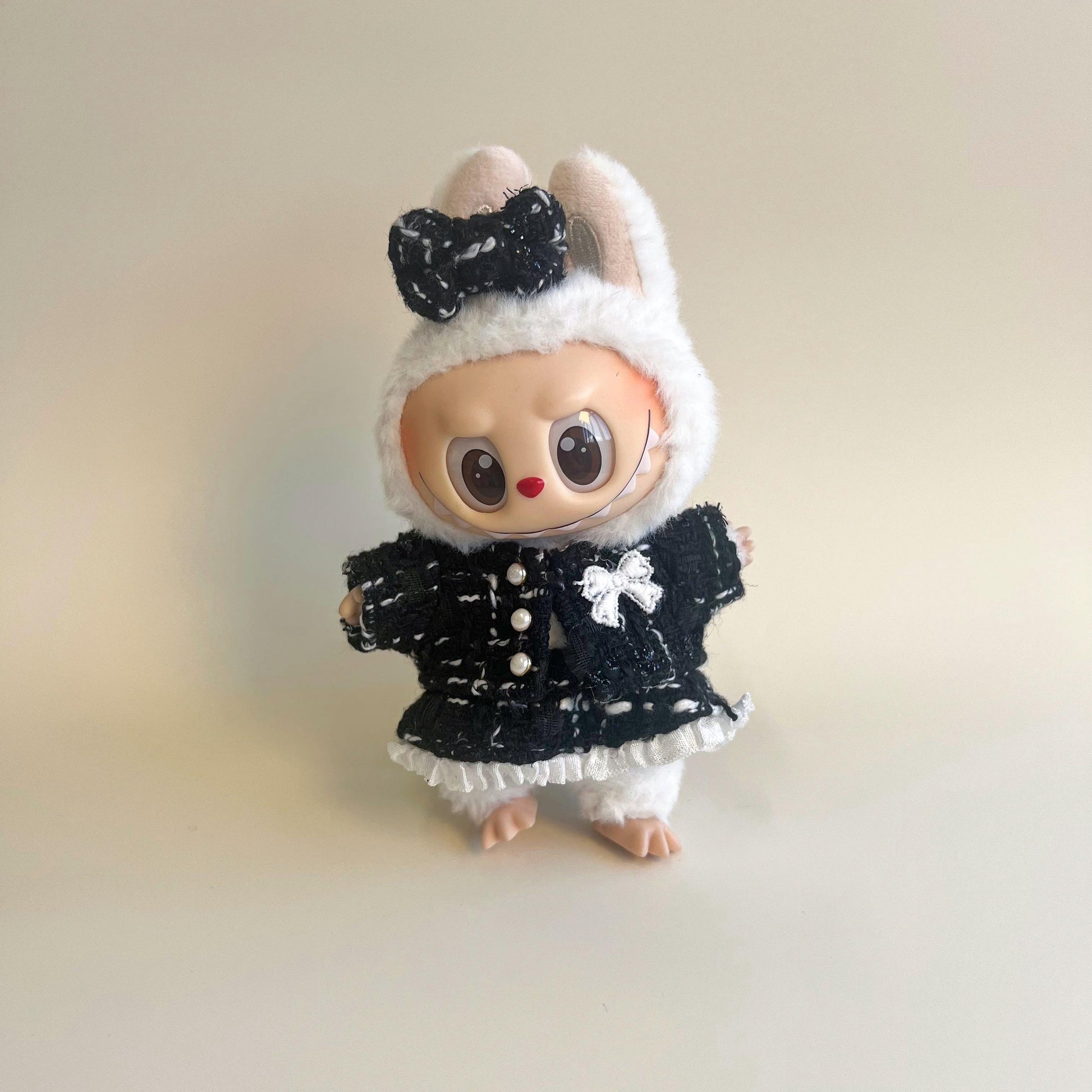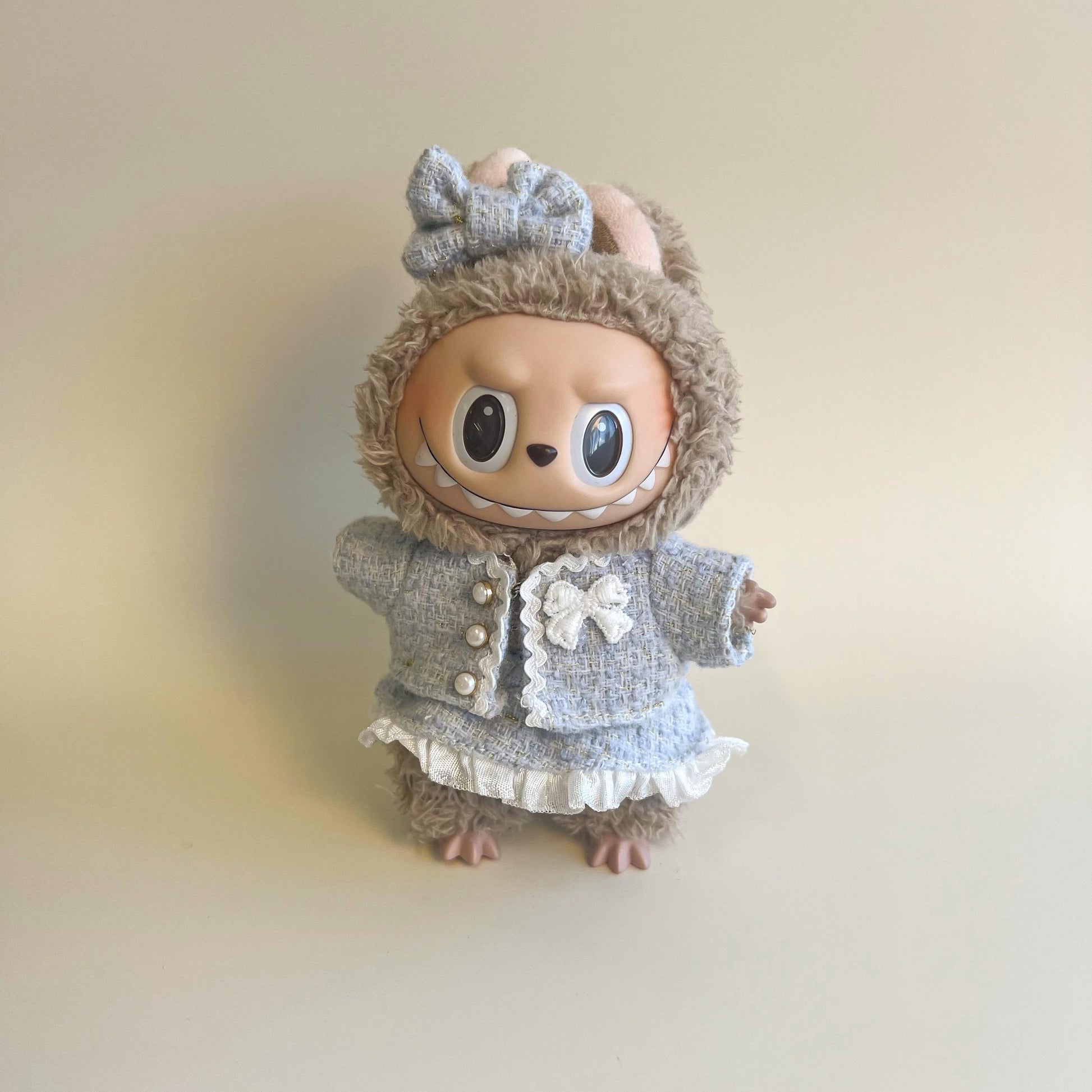 Transform your Labubu with the Tweed Dress Outfit – Pearl Button Style. This elegant design features a soft tweed jacket and matching skirt, accented with pearl buttons and a ribbon‑trim hem. Paired with a matching bow accessory. A chic and classic look, perfect for adding refined charm to your Labubu collection.