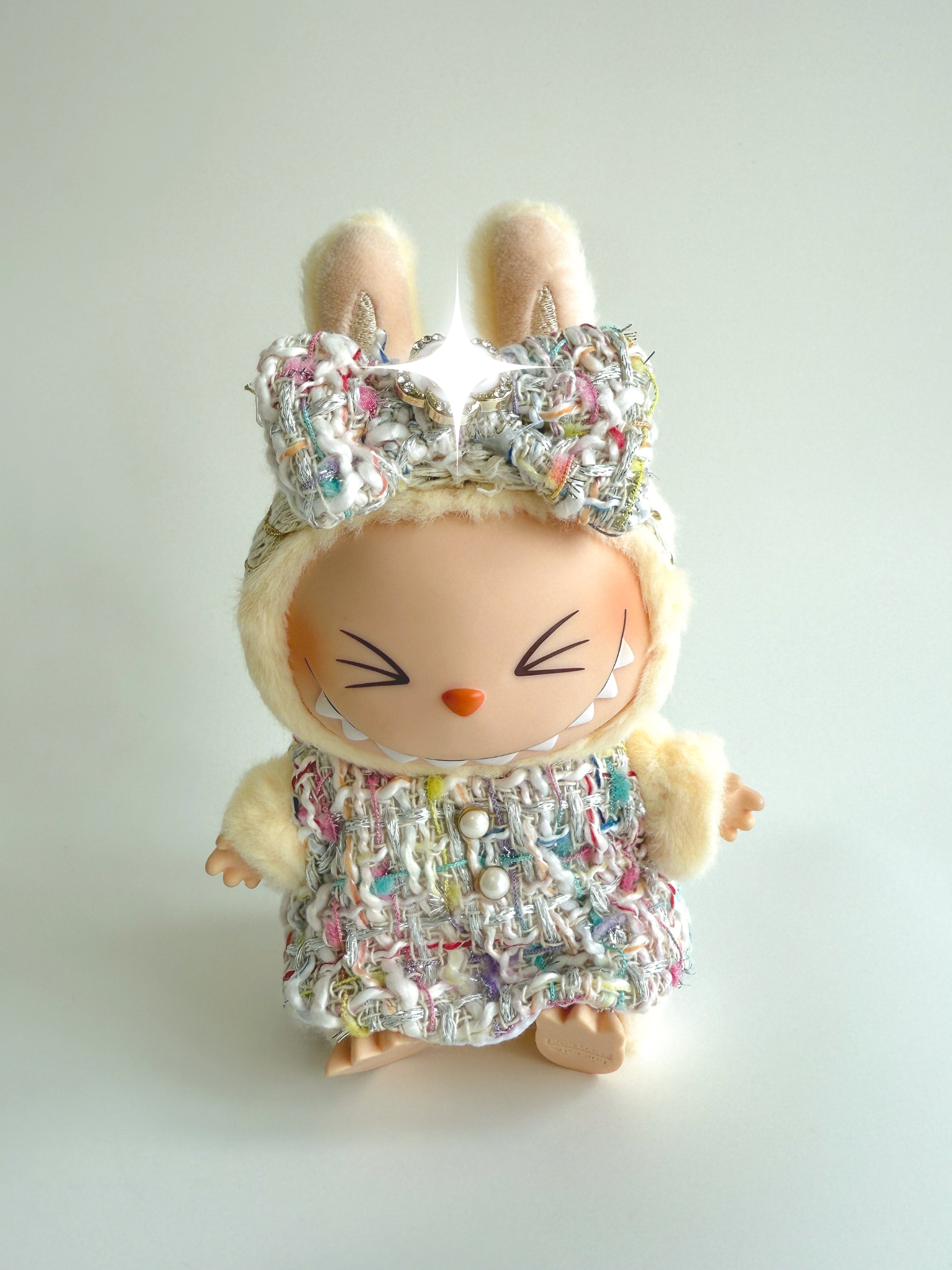Give your Labubu a winter makeover with the Winter White Tweed Set. This coordinated look features a white tweed dress flecked with pastel blue, pink, and yellow threads, finished with pearl‑style buttons, paired with a matching tweed bow headband adorned with a cream flower. The soft winter tones create a charming seasonal style.
